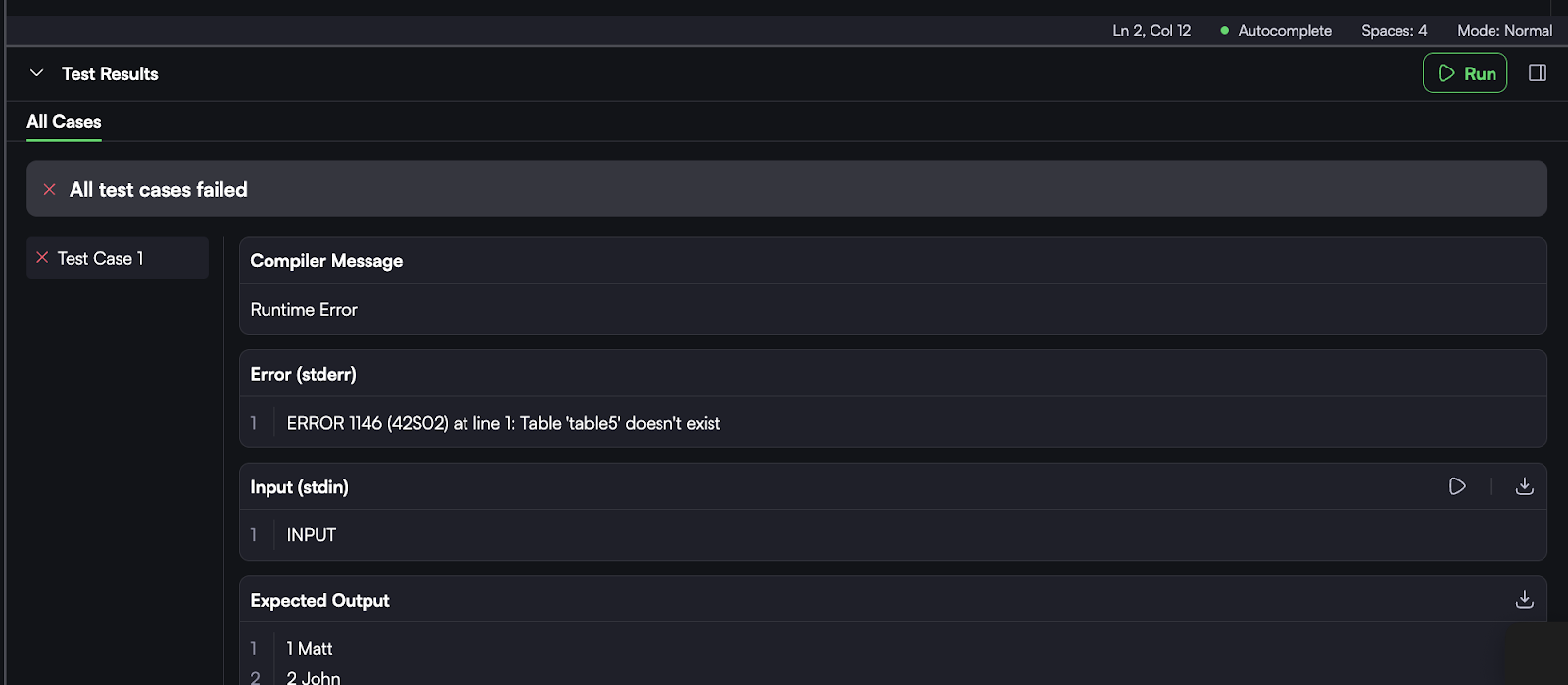 Click Run to execute the query and validate your solution. The results panel displays pass or fail status and any error messages, if applicable.